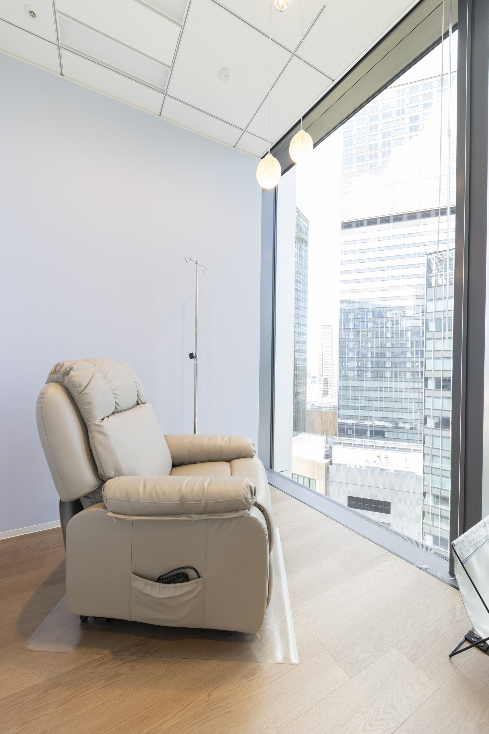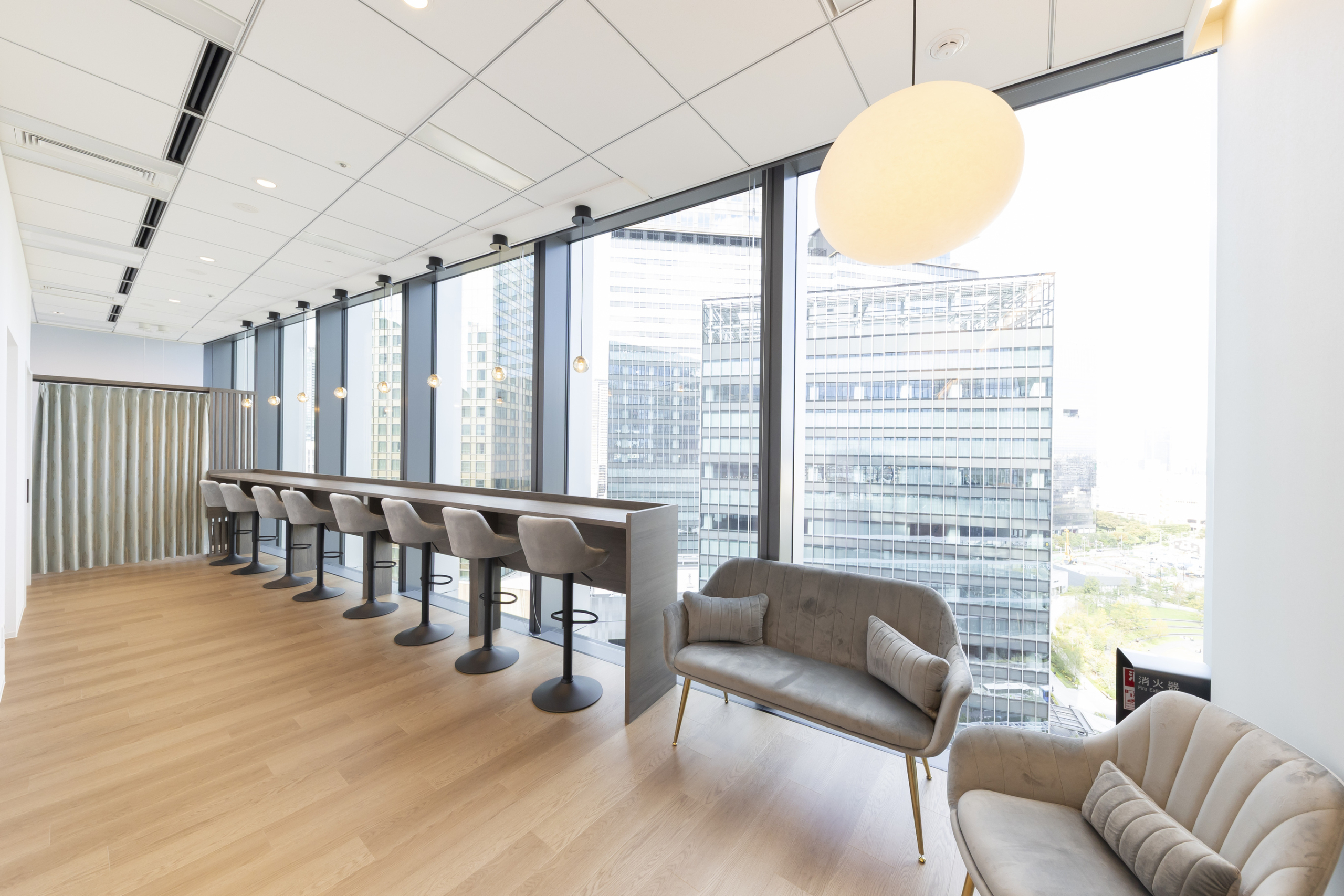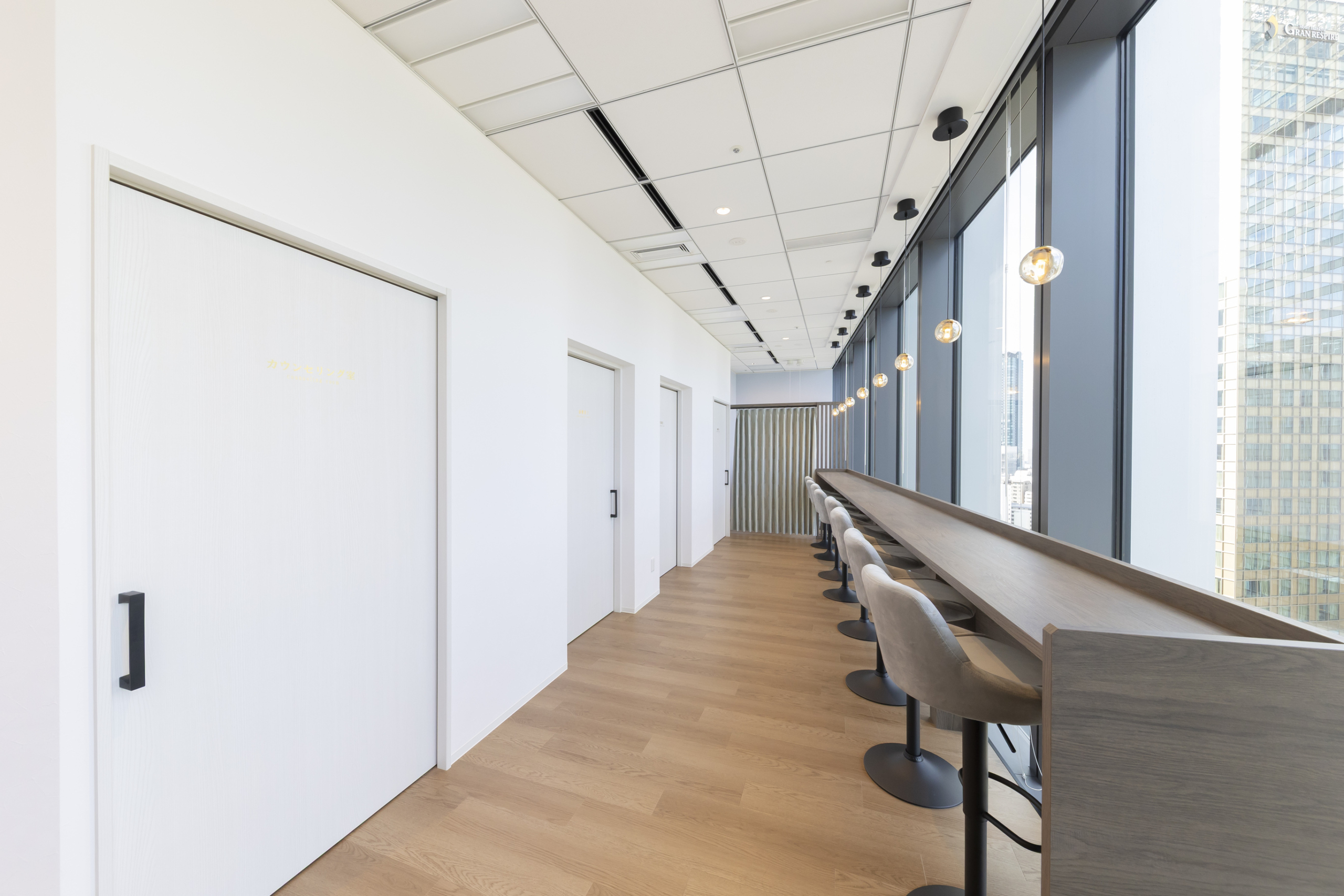 大阪グラングリーンを眼下にのぞむ見晴らしの良い場所、明るい大開口ガラスの待合室まで視線を誘導するため受付をななめに構えて奥行きと開放感を出しました。