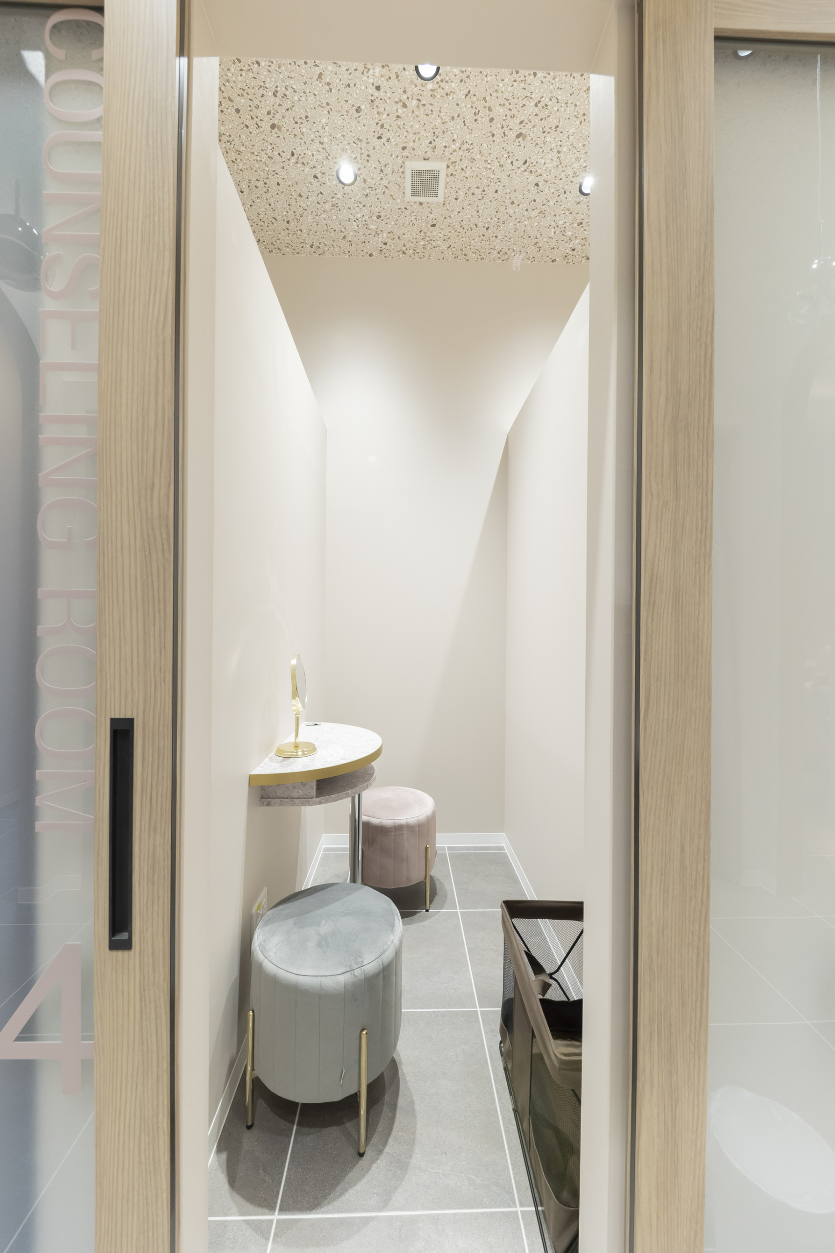 ガラス建具と間仕切りで構成したカウンセリング室は、閉塞感を与えず開放感を保ちながらも、しっかりとプライバシーを確保。
