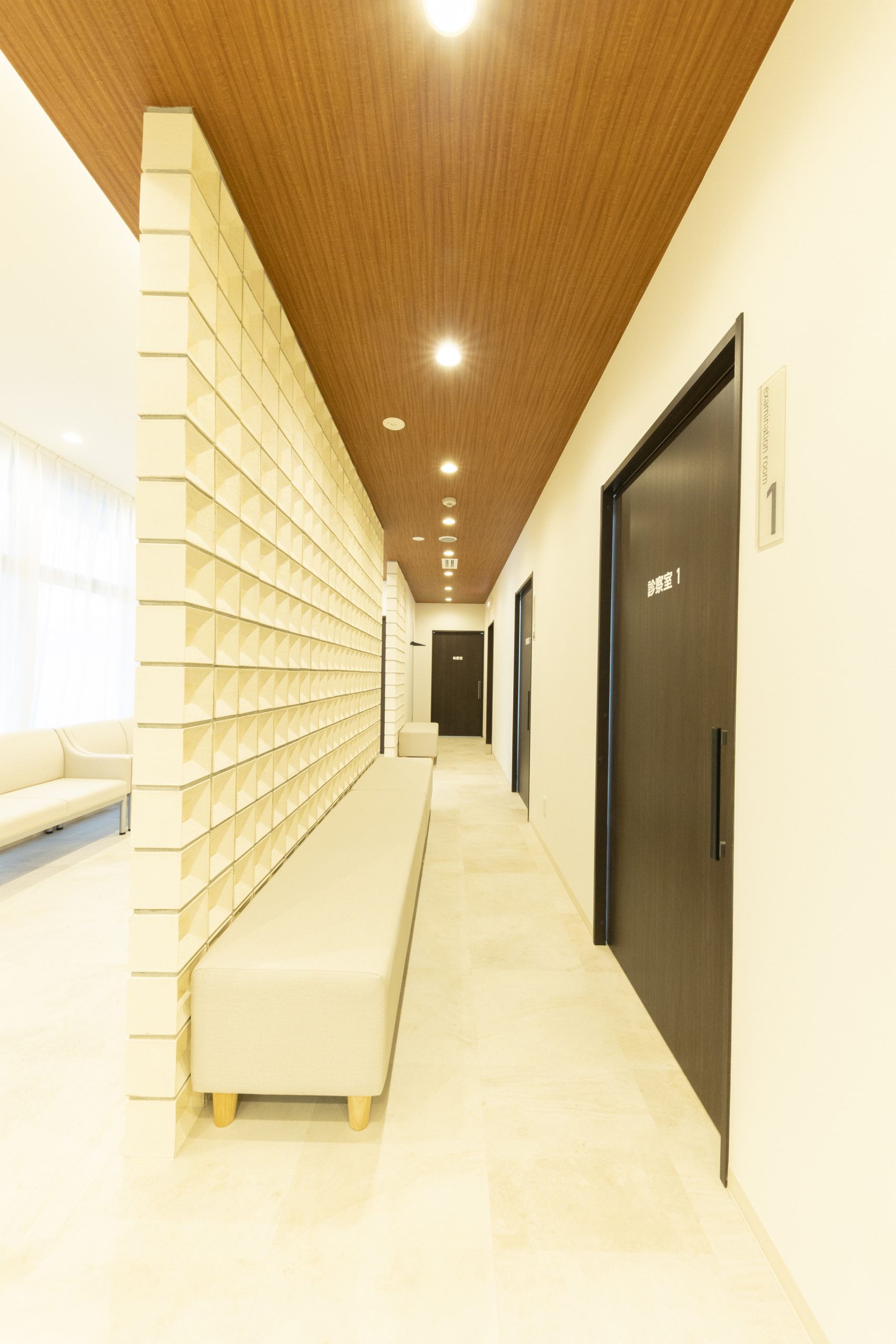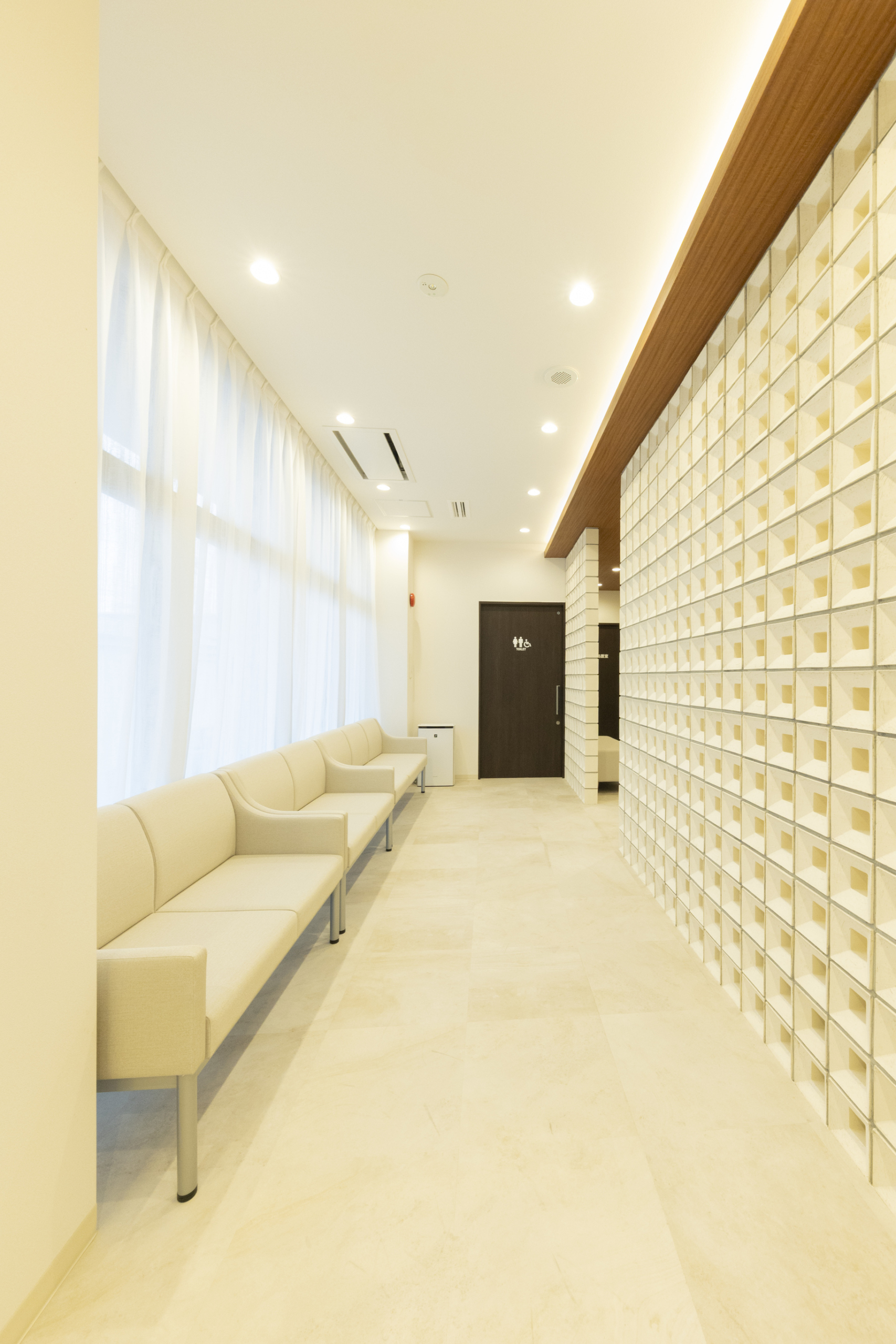 ポーラスブロック(穴あき化粧ブロック)を用いた受付・待合空間は、光の透け感と素材の質感が印象的で、他にはない独自のデザインを実現しています。